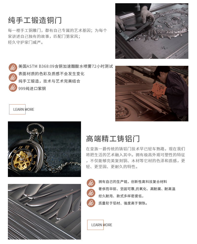 皇族一爵秉承公司18年的发展沉淀,保留传统工匠的同时,不断创新和引进国内外先进的数控生产设备,聘请国外资深设计团队,致力于打造 精,细,美,坚的铜铝艺术入户门。